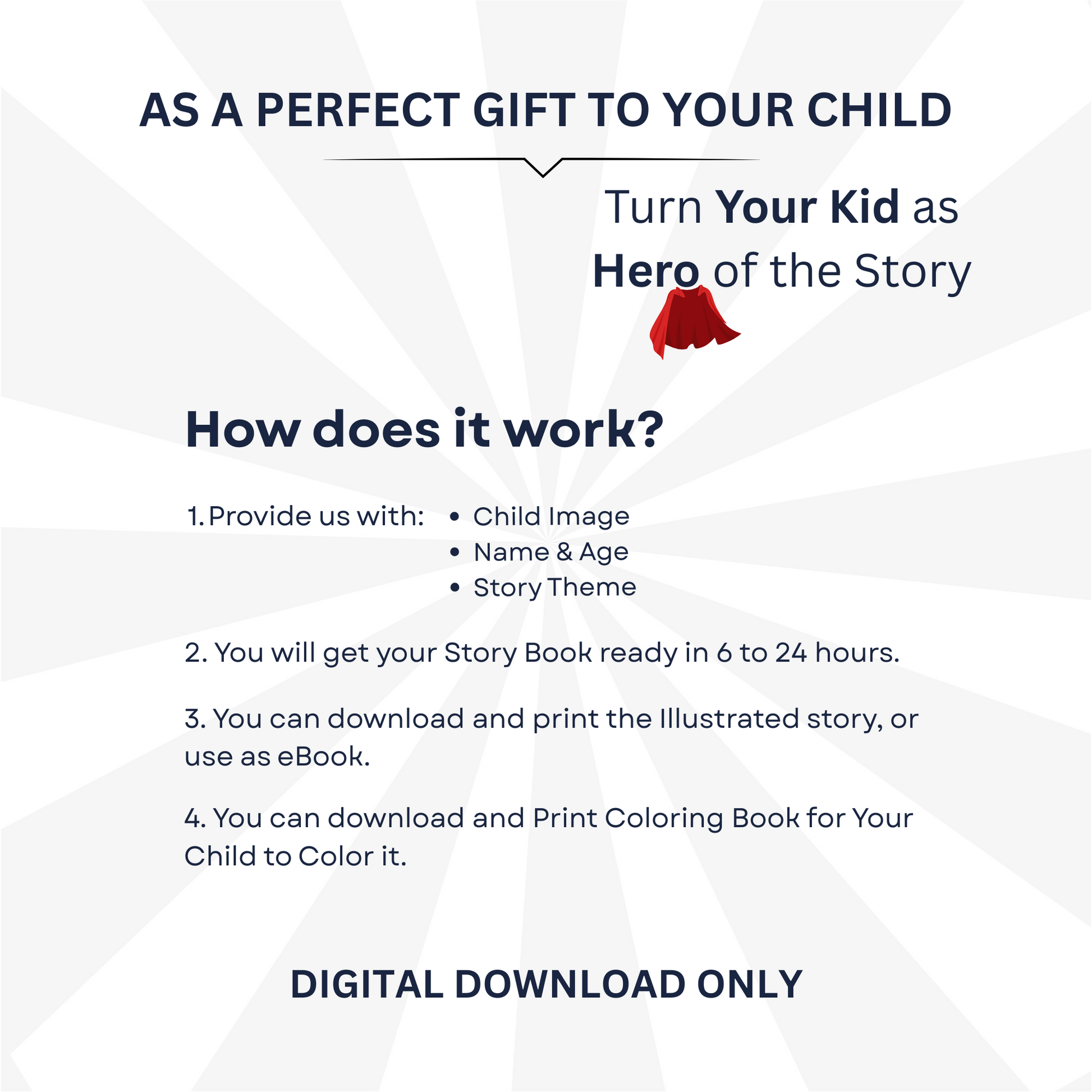 Do you want an illustrated story book with your child as a hero of it? We can make a custom story book with your Child's name (Story Main Character) and Avatar in it. Your Child will love it!